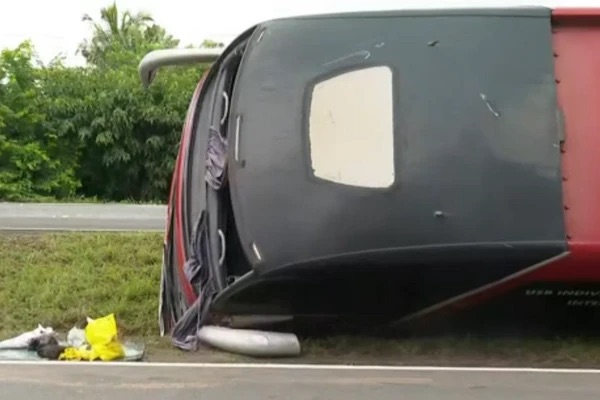 Acidente ocorreu na manhã desta segunda-feira (7) e deixou ao menos quatro feridos leves; veículo seguia viagem de Natal (RN) para Mato Grosso