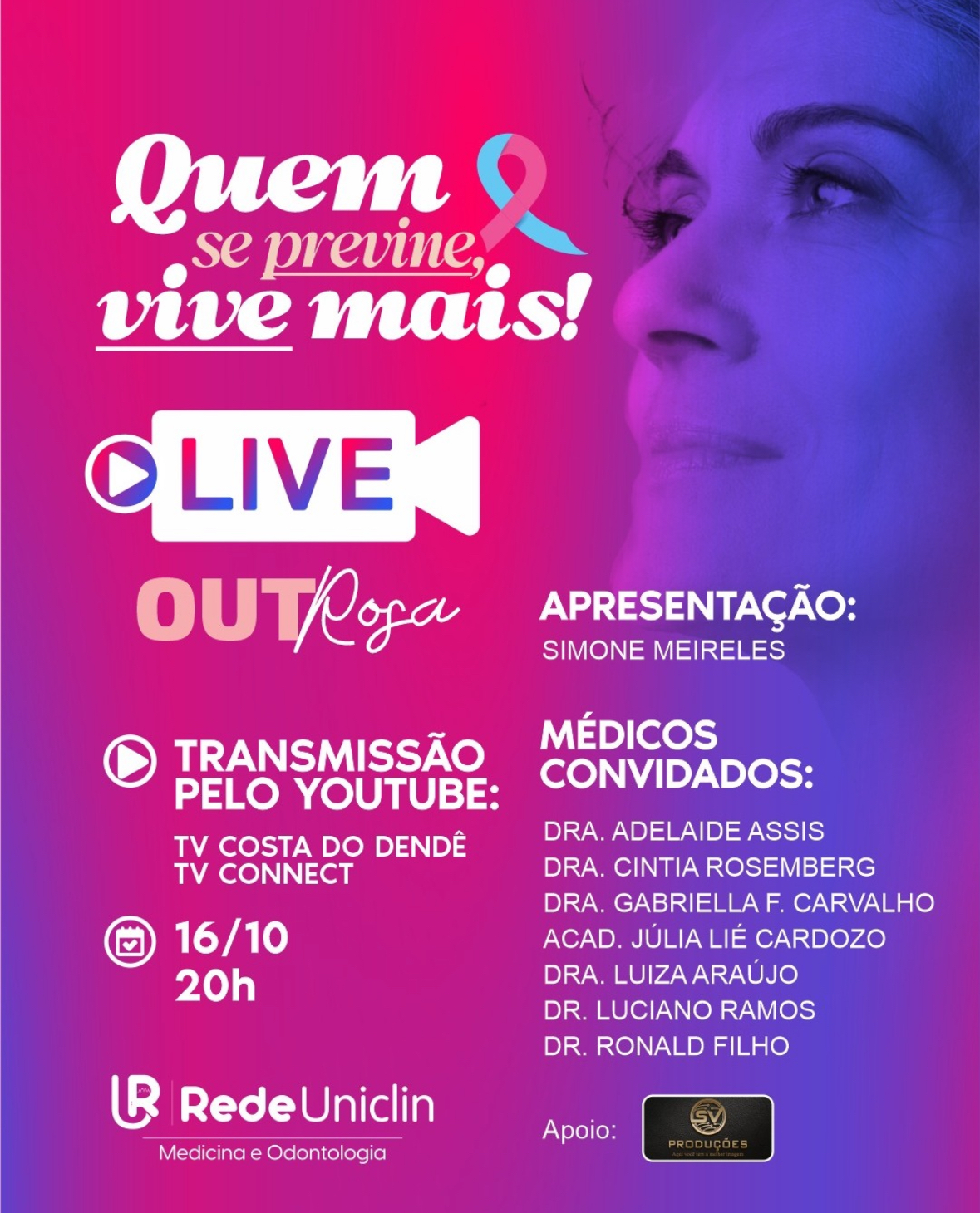 A campanha Outubro Rosa segue mobilizando a sociedade em torno da prevenção e do diagnóstico precoce do câncer de mama. E, como parte dessa mobilização, a Rede Uniclin – Medicina e Odontologia realiza nesta quinta-feira (16), às 20h, uma live especial com o tema “Quem se previne, vive mais!”, transmitida pelos canais TV Costa do Dendê e TV Connect no YouTube.
