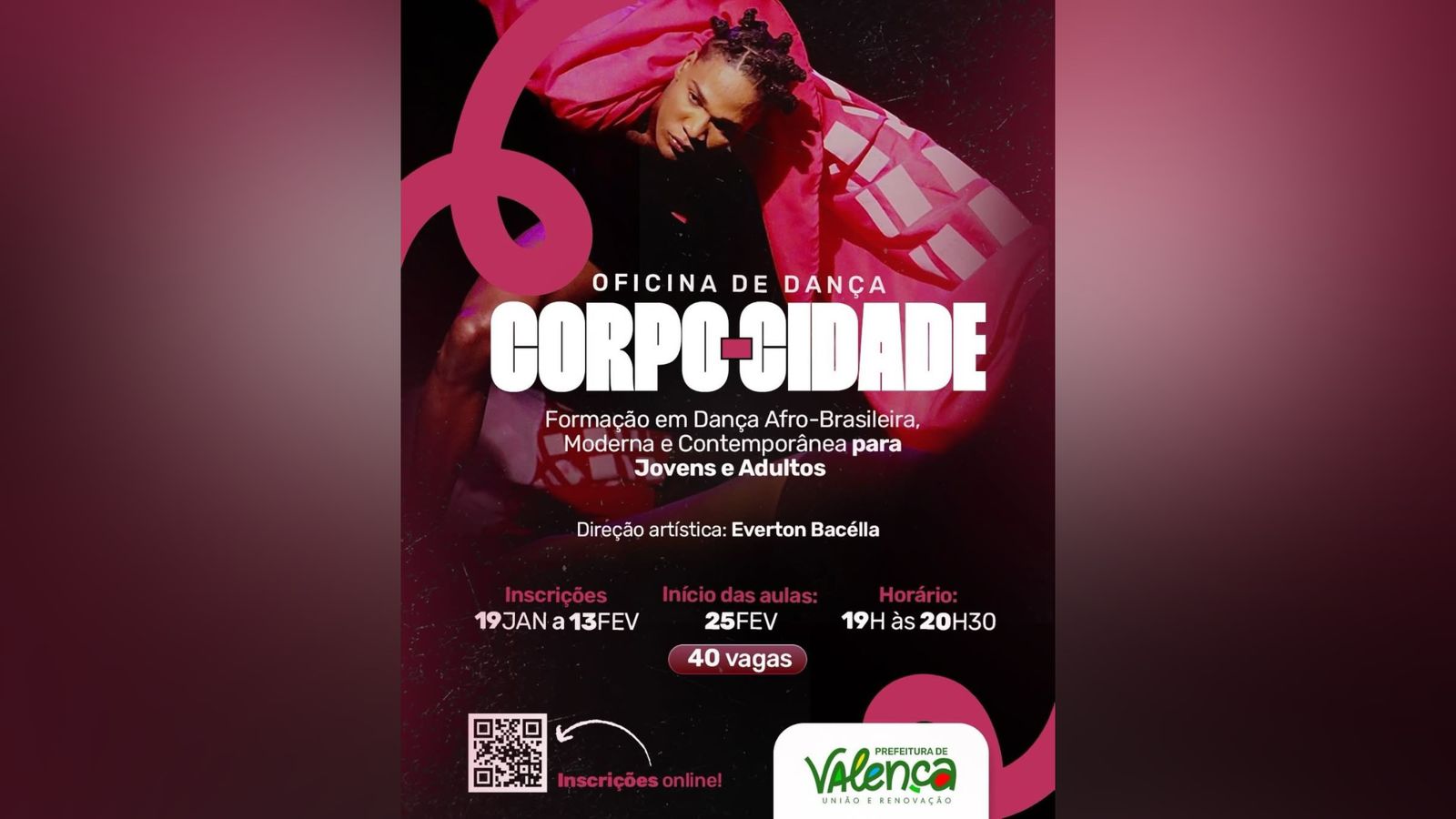 A Prefeitura de Valença, por meio da Secretaria Municipal de Cultura, está com inscrições abertas para a oficina de dança Corpo-Cidade, um projeto que propõe a relação entre corpo, movimento e espaço urbano, a partir de processos de experimentação, escuta e criação artística.