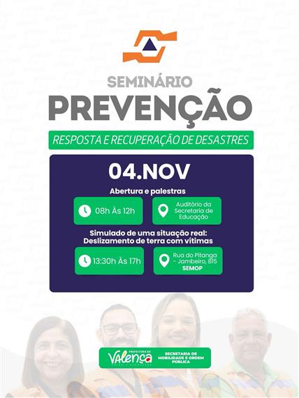 A Prefeitura de Valença, por meio da Diretoria Municipal de Proteção e Defesa Civil, convida a população para participar do Seminário em alusão ao Dia Internacional para a Redução do Risco de Desastres, que será realizado no dia 04 de novembro, com o tema “Prevenção, Resposta e Recuperação de Desastres”.