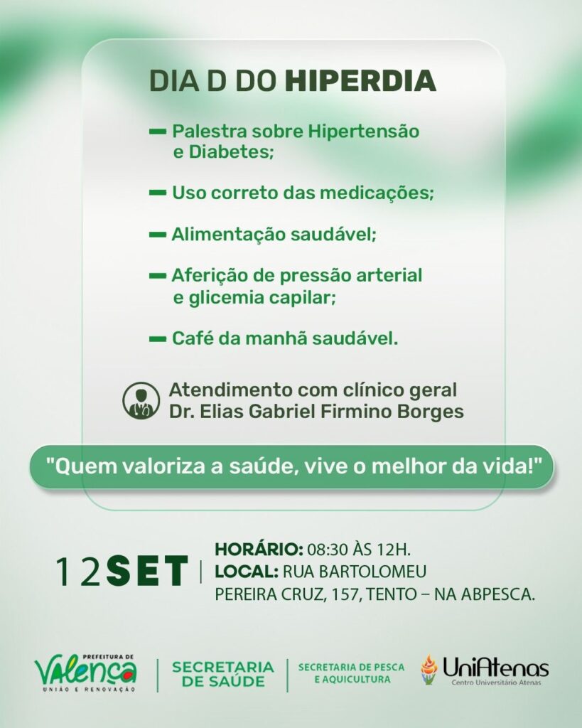 A Prefeitura de Valença, através da Secretaria Municipal de Saúde e da Secretaria de Pesca e Aquicultura, em parceria com o Centro Universitário UniAtenas, lança oficialmente o projeto “Laços de Saúde”, que tem como objetivo aproximar ainda mais os serviços de saúde da população, levando informação, prevenção e cuidados a diferentes comunidades do município.