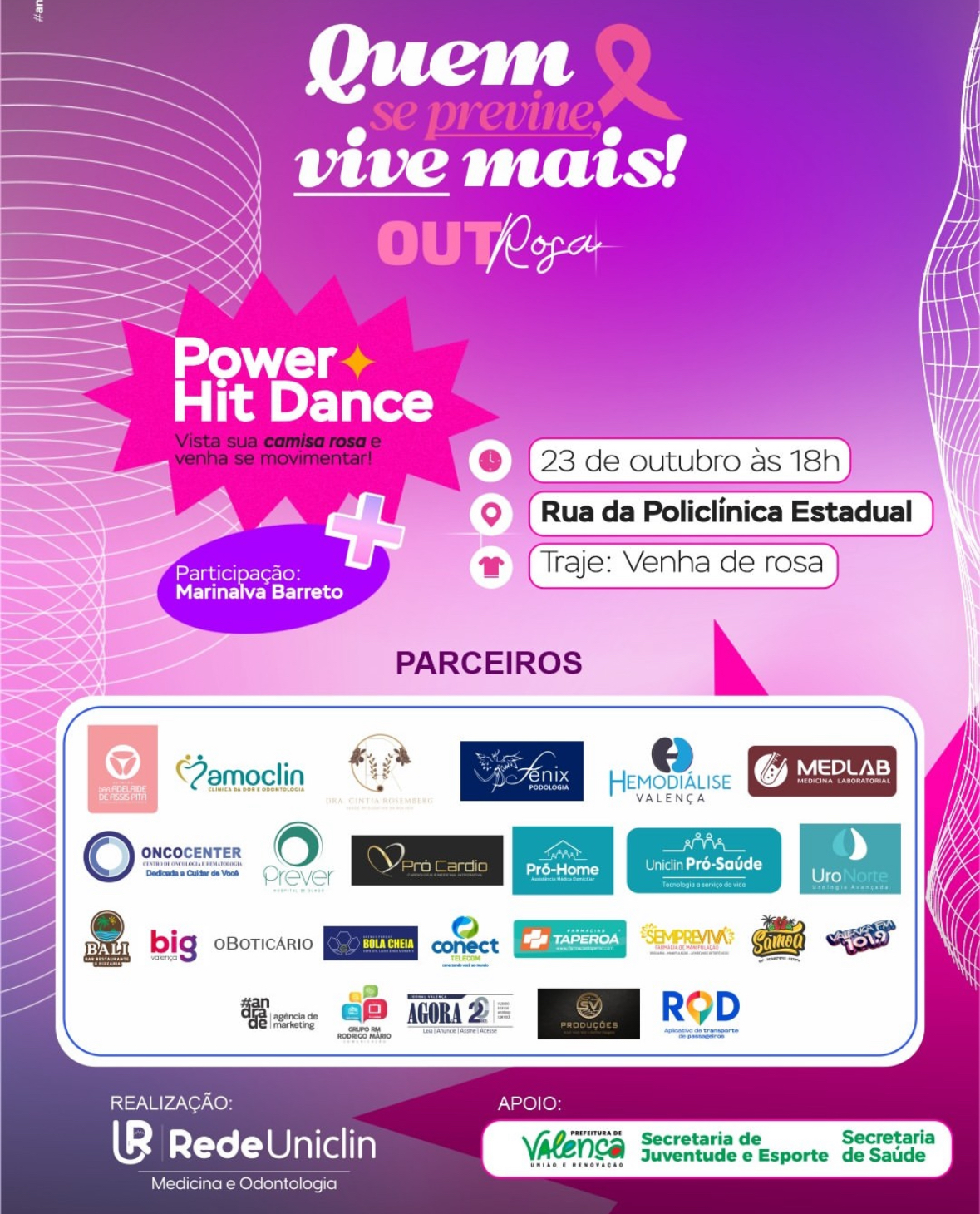 Em apoio à campanha Outubro Rosa, a Rede Uniclin, com o apoio da Prefeitura de Valença através das secretarias de Saúde, e de Juventude e Esportes e diversos parceiros, promove no dia 23 de outubro, às 18h, na Rua da Policlínica Estadual, uma atividade especial de conscientização e incentivo ao autocuidado: o Power Hit Dance, com a participação da instrutora Marinalva Barreto.