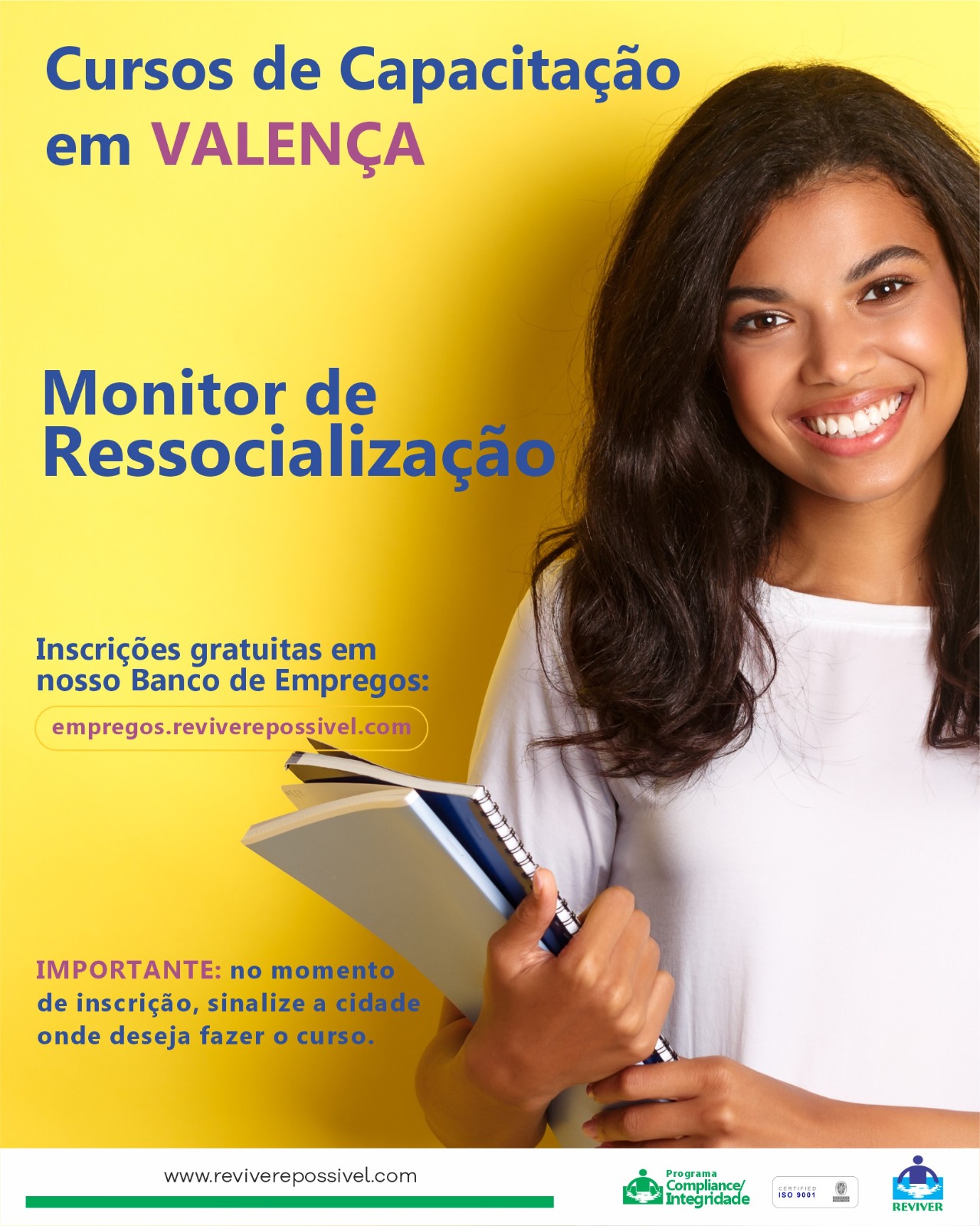 A inscrição gratuita será para Curso de Monitor de Ressocialização e para participar é necessário fazer um cadastro no banco de empregos da REVIVER: (idade mínima de 21 anos ): empregos.reviverepossivel.com