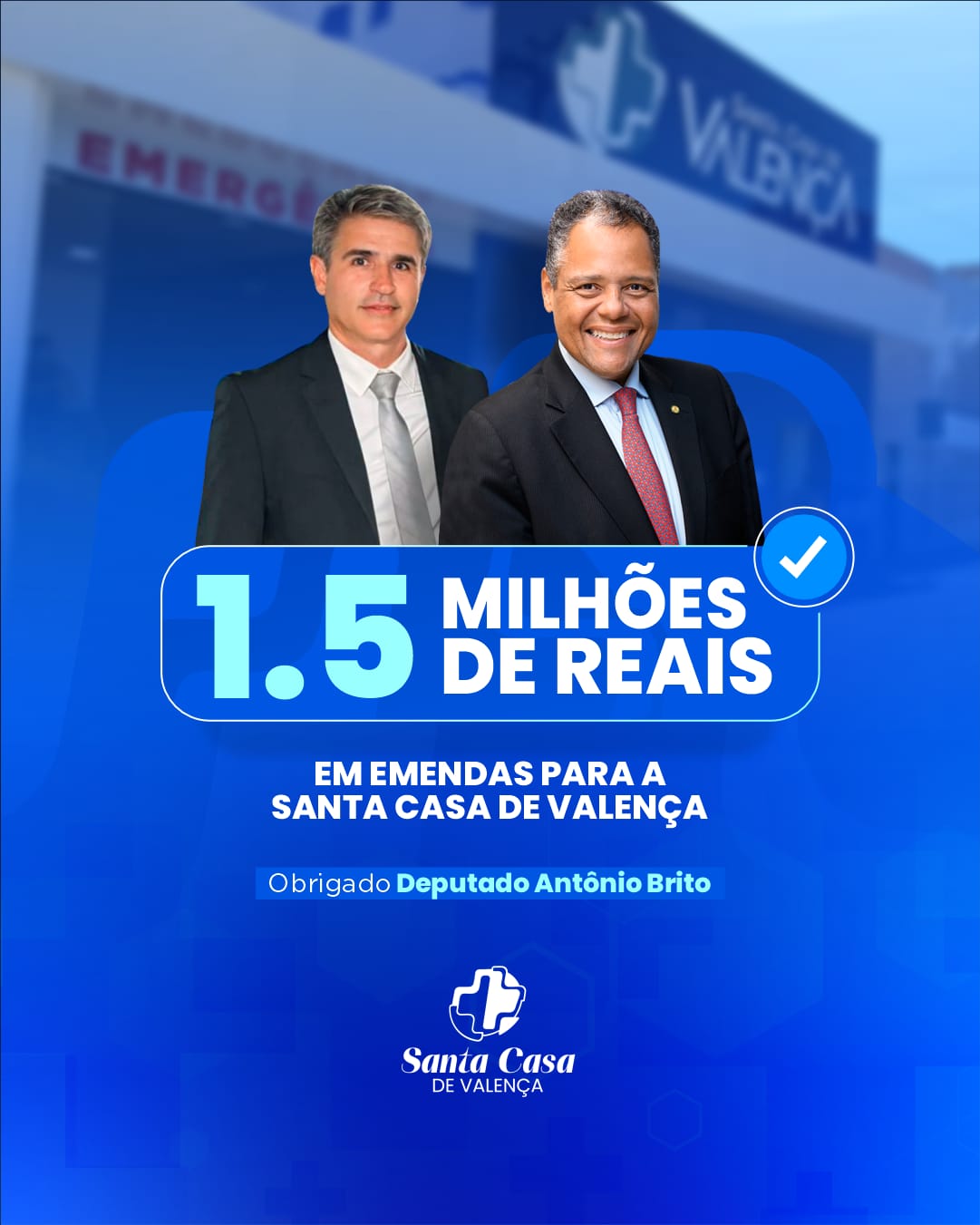 O deputado federal Antônio Brito, uma das vozes mais atuantes da Câmara Federal na defesa das Santas Casas e dos Hospitais Filantrópicos, sendo inclusive presidente da Frente Parlamentar em Defesa das Santas Casas e Entidades Filantrópicas, concretizou nesta semana a destinação de duas emendas parlamentares de custeio para a Santa Casa de Misericórdia de Valença, que totalizam o valor de R$ 1.550.000,00.