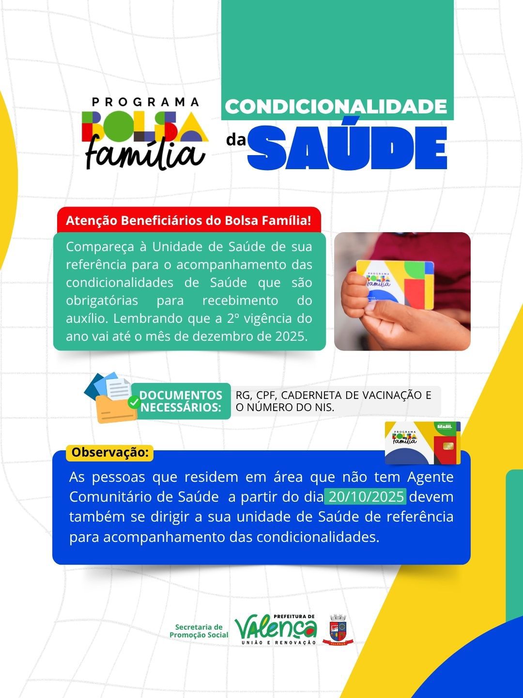 A Prefeitura de Valença, por meio da Secretaria de Promoção Social, informa que já começou o acompanhamento das condicionalidades de saúde do Programa Bolsa Família, etapa obrigatória para a continuidade do recebimento do benefício.