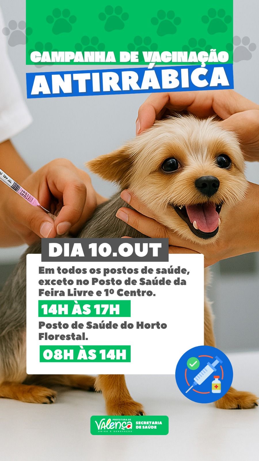 A Prefeitura de Valença, por meio da Secretaria Municipal de Saúde, realiza nesta sexta-feira (10) mais um dia da Campanha de Vacinação Antirrábica. A ação acontece das 14h às 17h, em todos os postos de saúde do município, exceto no Posto de Saúde da Feira Livre e no 1º Centro. No posto de saúde do Horto Florestal, a ação acontece das 08h às 14h.