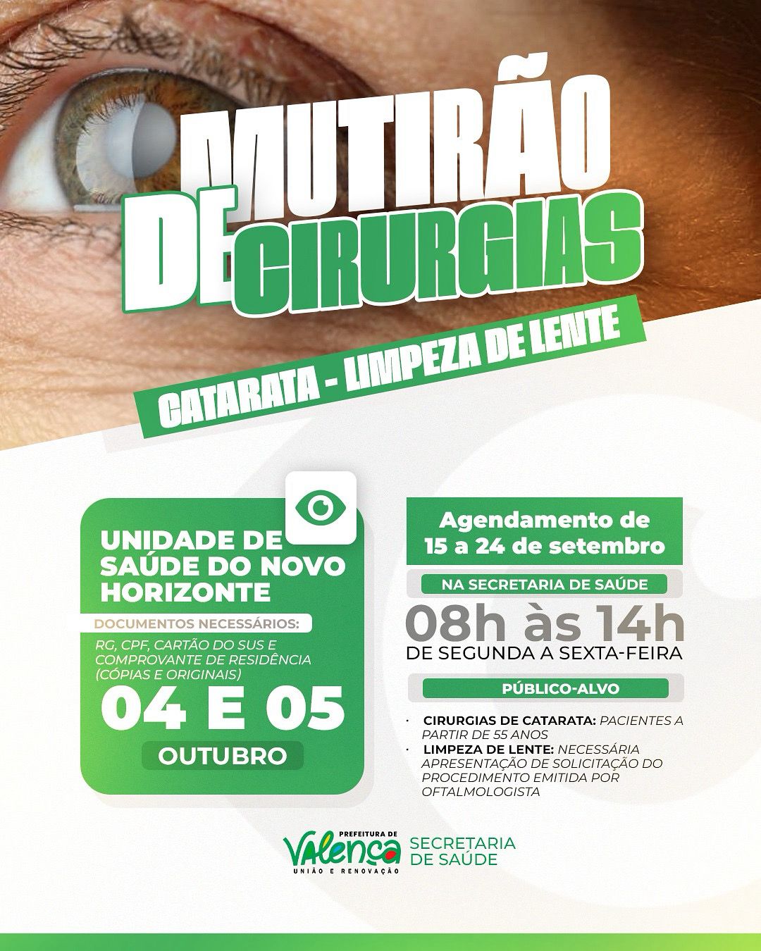 A Prefeitura de Valença, por meio da Secretaria de Saúde, realizará nos dias 04 e 05 de outubro um mutirão de cirurgias de catarata e limpeza de lente, na Unidade de Saúde do Novo Horizonte.O agendamento acontece de 15 a 24 de setembro, na Secretaria de Saúde, das 08h às 14h, de segunda a sexta-feira.Para participar, é necessário apresentar RG, CPF, Cartão do SUS e comprovante de residência (originais e cópias).O público-alvo são pacientes a partir de 55 anos para cirurgias de catarata e aqueles que necessitam de limpeza de lente, mediante solicitação emitida por oftalmologista.“Esse mutirão é uma oportunidade de devolver qualidade de vida aos pacientes que aguardam pelo procedimento. Nosso compromisso é ampliar o acesso à saúde e cuidar da visão da nossa população”, destacou a secretária de Saúde de Valença, Adriana Couto. A iniciativa busca ampliar o acesso à saúde ocular e garantir mais qualidade de vida para a população valenciana.SECOM | Prefeitura Municipal de Valença