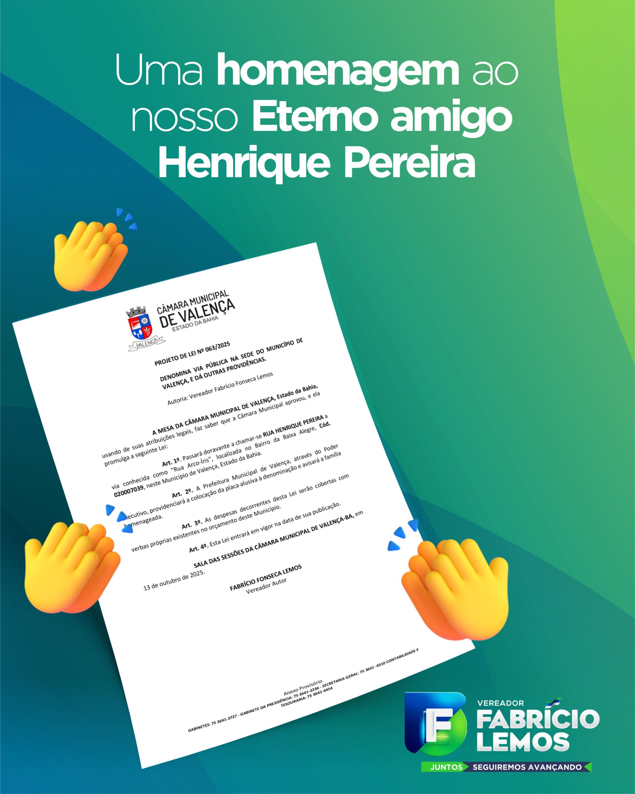 A Câmara Municipal de Valença aprovou o Projeto de Lei nº 068/2025, de autoria do vereador Fabrício Fonseca Lemos, que denomina Rua Henrique Pereira a via anteriormente conhecida como Rua Arco-Íris, localizada no Bairro da Baixa Alegre, em Valença.